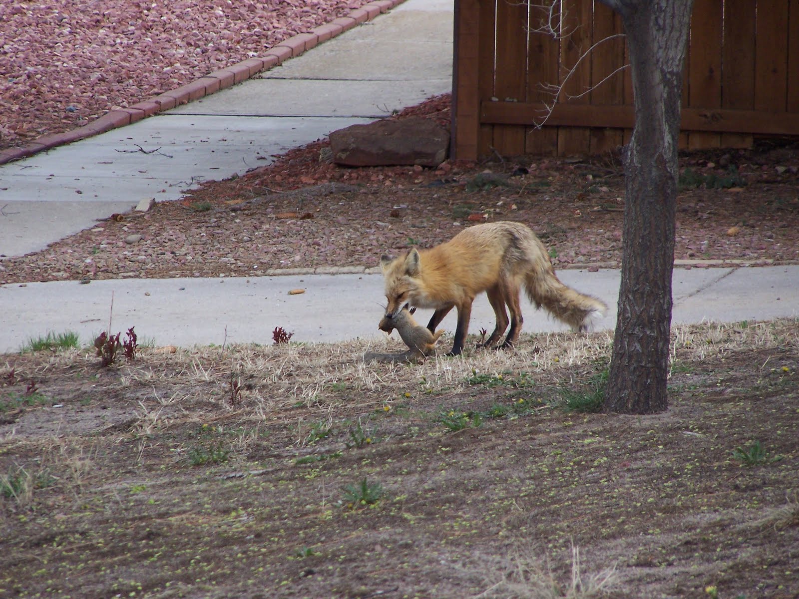 Sunday morning I went out for the paper and noticed the neighborhood fox sitting in the neighbor’s yard stalking a squirrel in the tree. By the time I gathered the children and grabbed the camera, the fox had moved to the street for a better view and better shot. We watched for a few minutes then went back to our preparations for church, that is, everyone but Isaac, who wanted to see the drama unfold. His patience paid off, as did the patience of the fox, for within fifteen minutes the squirrel (no doubt having lost his patience) made a run for it, becoming a nice breakfast for a fox family.